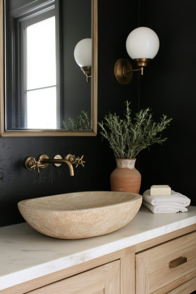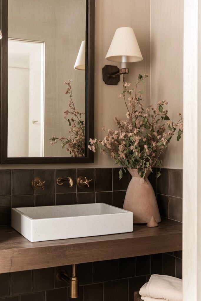 - Mirror: A thin black or burnished brass frame keeps things crisp against dark walls.