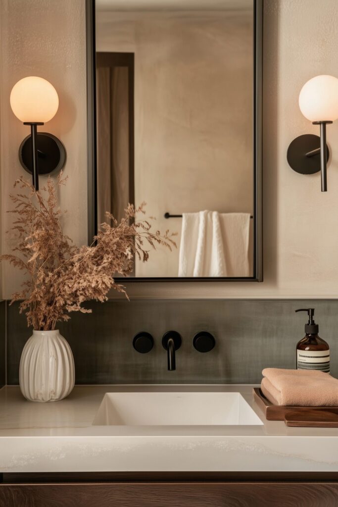 Soft diffusion, side lighting, and warmth. Opal or alabaster shades wrap light around the face instead of throwing hard shadows down. You should mount sconces 6-8″ from the mirror edge, at eye level, and dim them to around 60% for the most flattering glow. Opt for a 40-60W equivalent in LED at 2700K-3000K. Any color temperature cooler will be at odds with your dark palette.