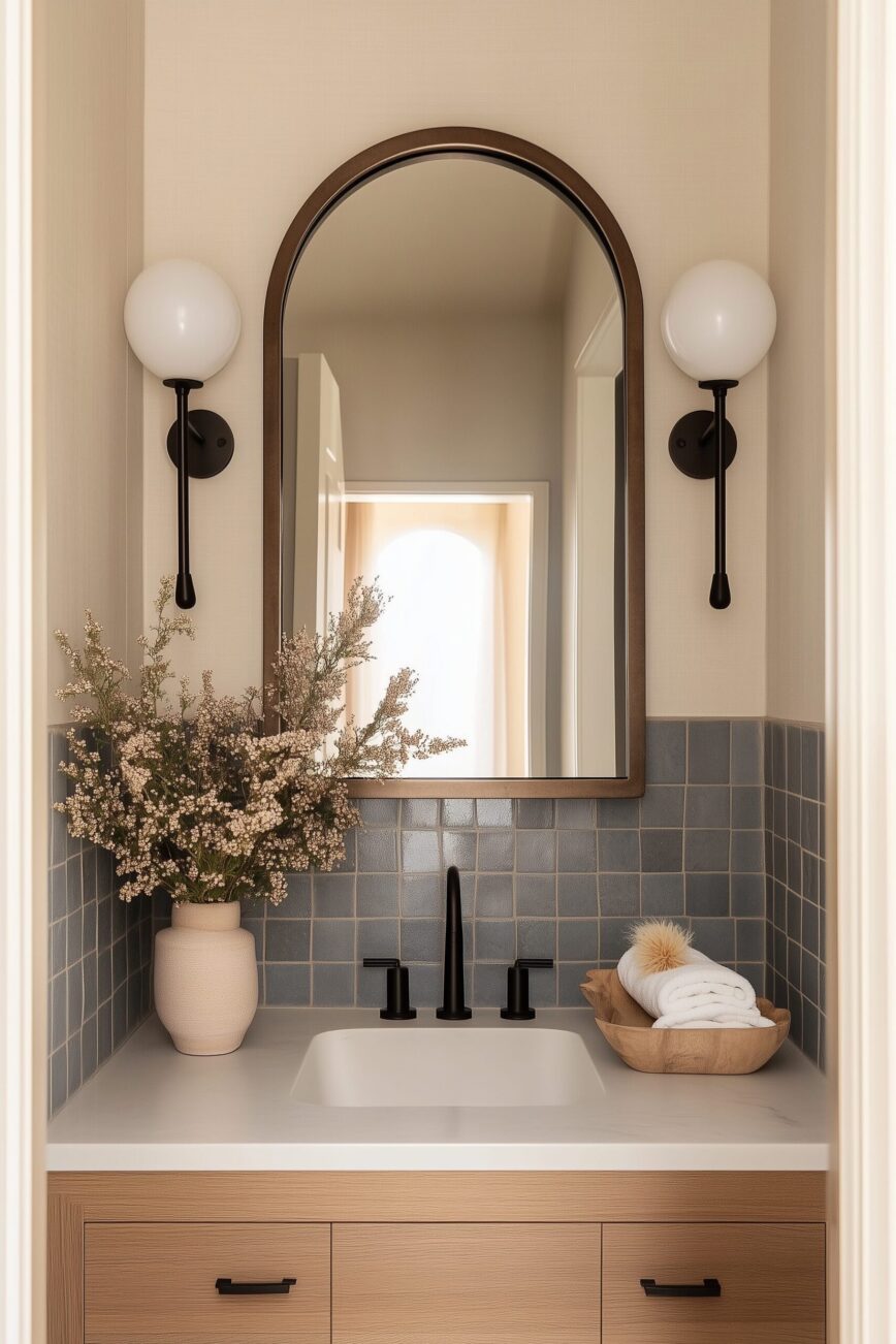 In a small moody powder room, sconces with warm (2700K–3000K) dimmable bulbs, warm diffused shades (opal glass, alabaster, or linen), and at overall eye level (center of shade ~60”–66” from the floor and flanking the mirror when possible). Matte black and brass finishes will work well with the moody inky walls and globe, cone, or linen-shade will soften shadows. If what you are after is that Pinterest-worthy glow for “dark moody powder room lighting,” “earthy modern powder room,” or “matte black bathroom sconce,” all 20 of these options below have you covered, with quick styling notes so you avoid overthinking.