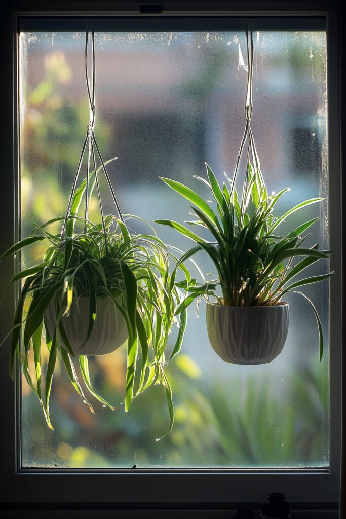 - Spider plant: Hanging baskets; easy propagation; medium light.