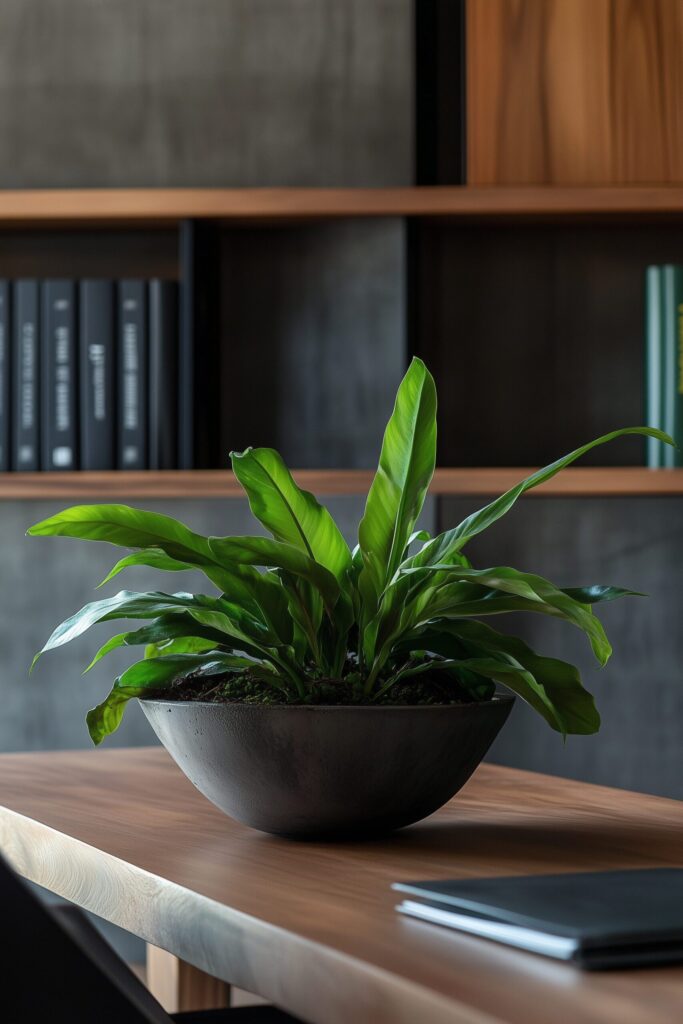 The bird’s nest fern (Asplenium nidus) showcases wavy fronds with an eye-catching form that make it a design-quality plant without being fussy. It prefers medium light and consistent—but moderate—moisture. While other ferns can be picky about missed misting, the bird’s nest is more forgiving. It has a very clean, sculptural form that lends itself well to nightstands or console table.