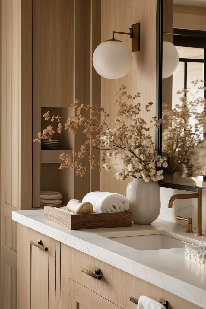 Having consistency brings an element of calm. Whenever your mirror, lighting, and hardware are coordinated in tone and proportion, your bathroom looks decidedly more expensive. It does not need to match exactly – think more of trends than lookalikes. For example, if your faucet is brushed gold, you can also use soft brass sconces in lieu of yellow brass. If your mirror is framed in matte black, it works if you choose a compatible finish for your fixtures.