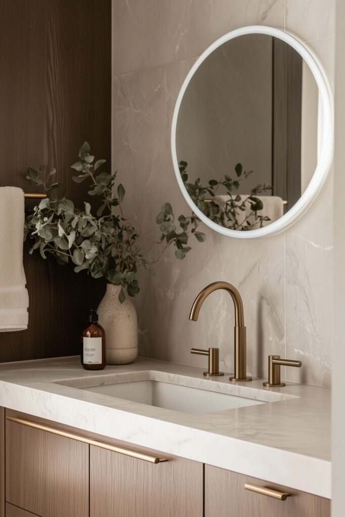 Layer light sources, add dimmers, and coordinate finishes between fixtures, hardware, and mirrors.