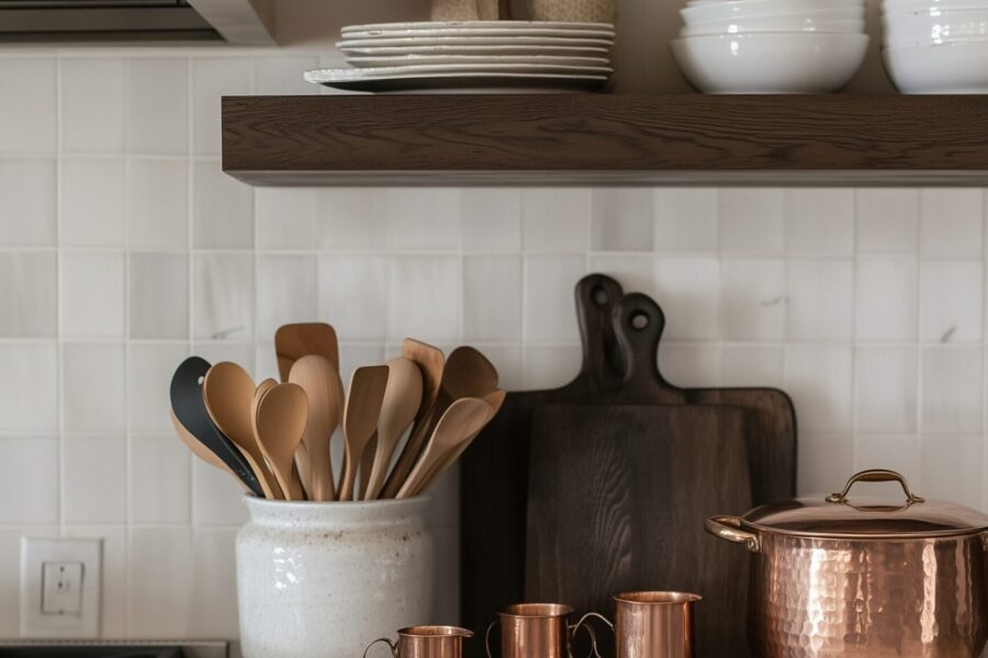 How to Style Floating Wood Shelves in a Farmhouse Kitchen