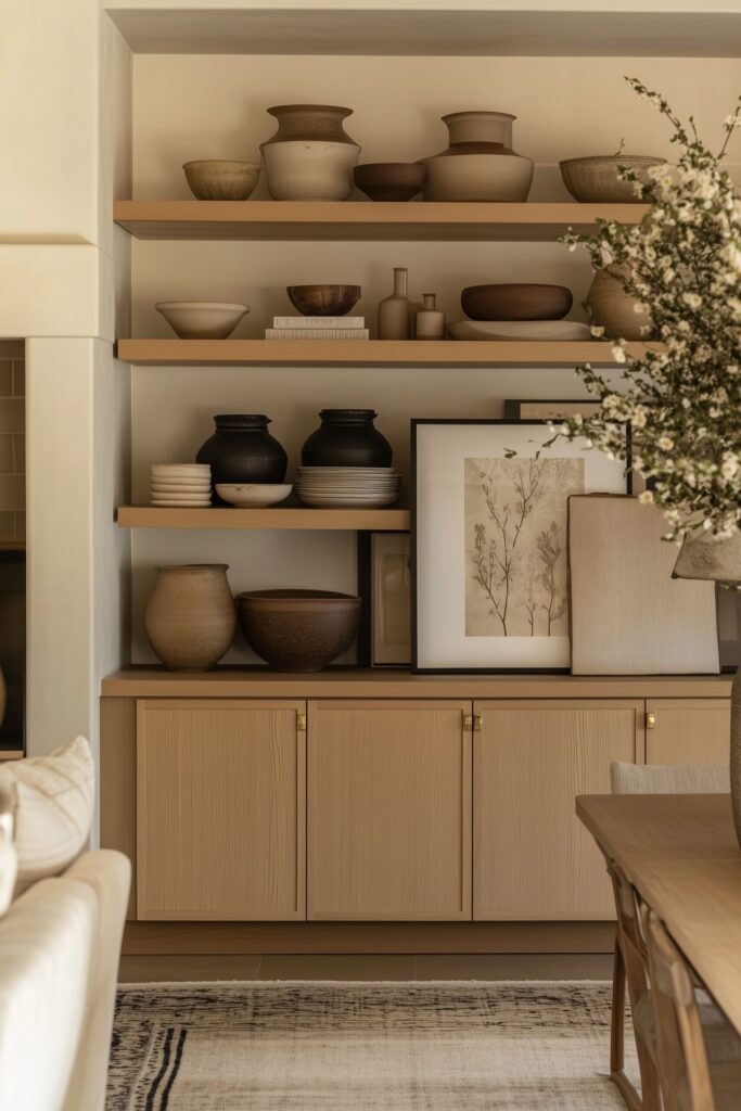 Shelving is where the whole visual story unfolds. A good trick is to think in zones rather than piles: top shelves for display, middle shelves for function, and bottom shelves for storage. The secret lies in playing with height, symmetry, and negative space.